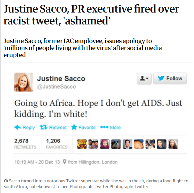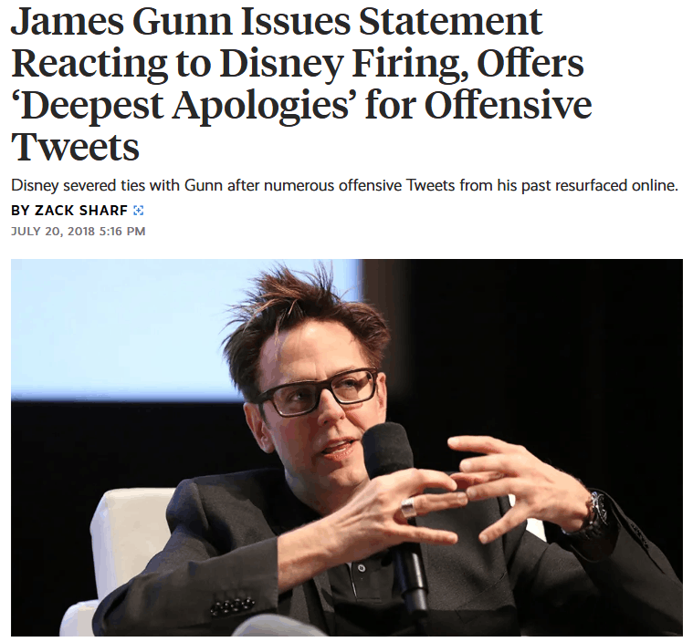 В 2018 году консервативные журналисты нашли старые твиты Джеймса Ганна, режиссера «Стражей Галактики 3», содержащие шутки на темы насилия и Холокоста. Хотя Ганн к тому времени уже давно вел аккаунт иначе и извинялся за прошлое, твиты были восприняты как абсолютно недопустимые. Тему подхватили таблоиды.
