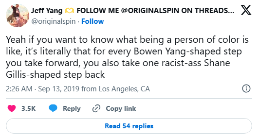 В сентябре 2019 года, всего через несколько дней после того, как было объявлено о присоединении комика Шейна Гиллиса к составу популярного шоу Saturday Night Live (SNL), всплыли видеозаписи из его подкаста 2018 года. Там Гиллис использовал оскорбления в адрес китайцев и шутил на другие спорные темы. В соцсетях разгорелся скандал, Шейн защищал себя и активно вступал в диалог. Некоторые поддержали его, но большая часть осудила.
