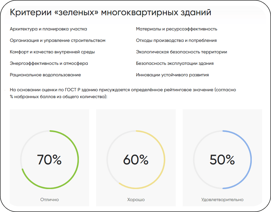 Экологичное строительство. С 2022 года в России действует «зеленый» ГОСТ для многоквартирных домов, а с 2024 — для частных. Стандарты основаны на международной экспертизе BREEAM, LEED и DGNB. Застройщики могут пройти оценку по экологическим критериям и получить сертификат соответствия.