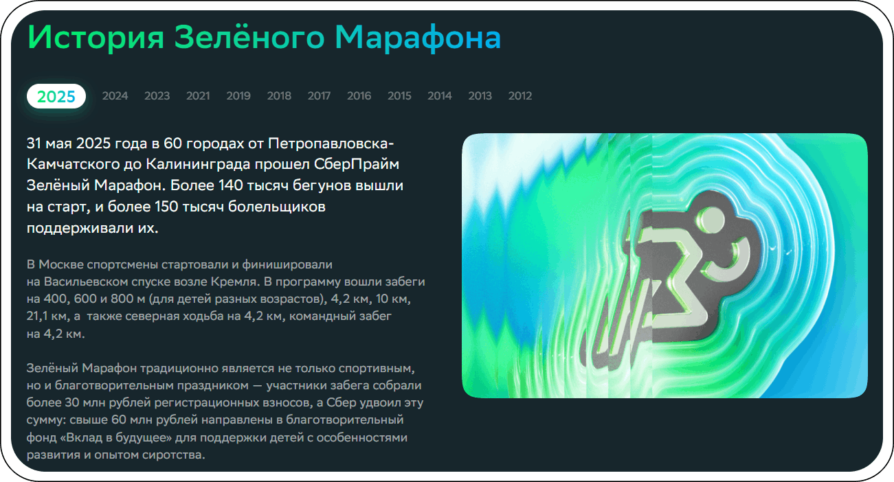 Общественные проекты и благотворительность — защита уязвимых групп населения, поддержка животных, инициативы по сбору средств, спортивные акции. Например, Зеленый марафон от Сбербанка.