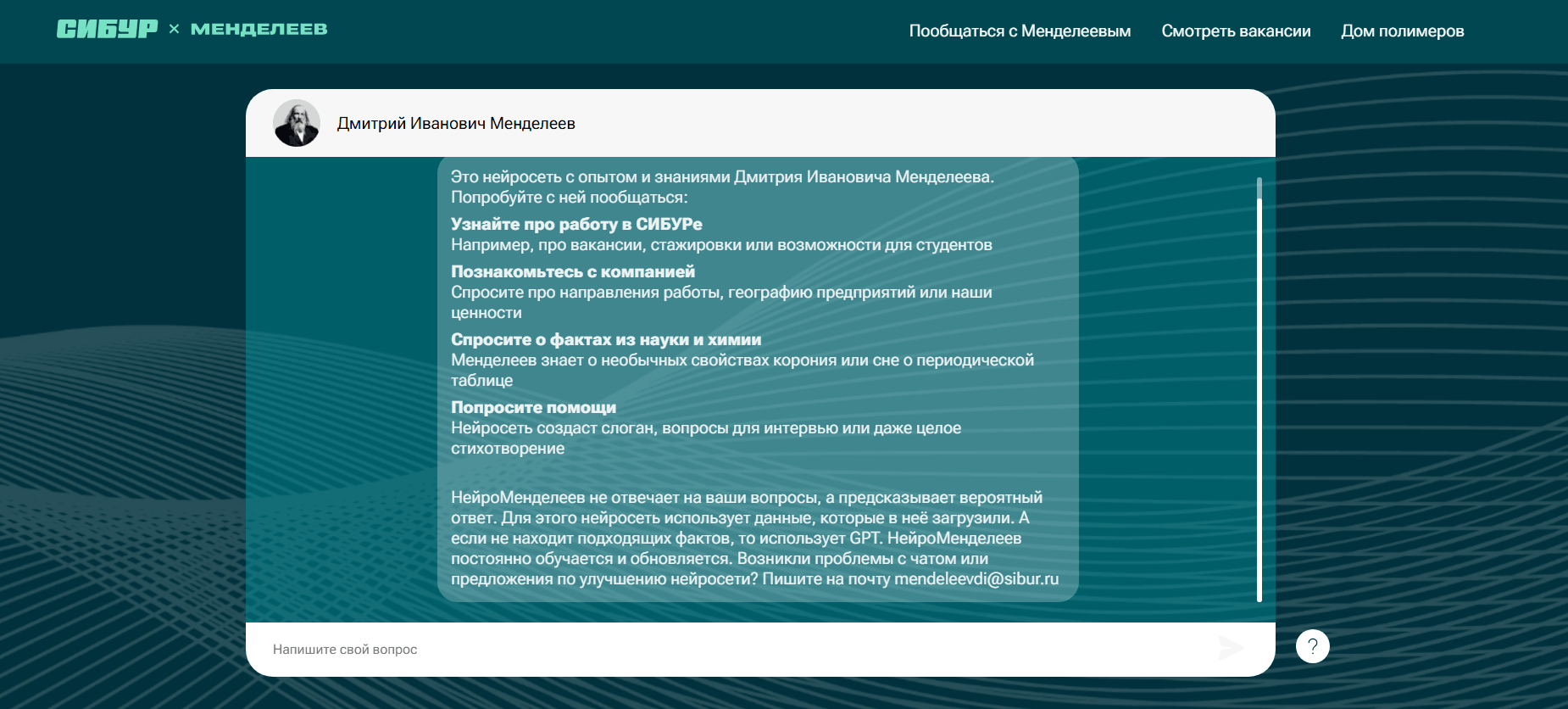 Активно развиваются нейроконсультанты, которые экономят время пользователей и снижают нагрузку на службу поддержки. Ассистентов уже внедрили Сбербанк, ВТБ, Почта России и другие компании. Из креативного — оживший Менделеев от нефтегазохимического холдинга СИБУР. Дмитрий Иванович консультирует соискателей по вакансиям, рассказывает про географию предприятия и ценности команды. Бонусом поможет подтянуть знание химии.
