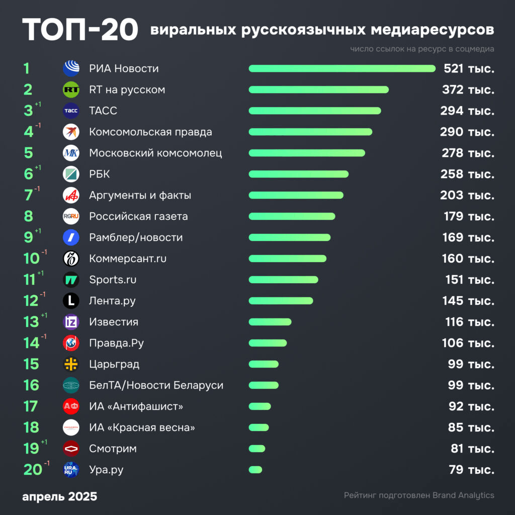 Согласно НАФИ, за два года процент доверия к отзывам снизился на 9 — с 80% до 71%. Растет число фейков, сделанных через ИИ. На первый план выходит вес источника: как для алгоритмов поисковых систем, так и для самих пользователей. Брендам приходится тщательно подходить к выбору инфлюенсеров и каналов для размещения. На скриншоте регулярное исследование Brand Analytics по СМИ.
