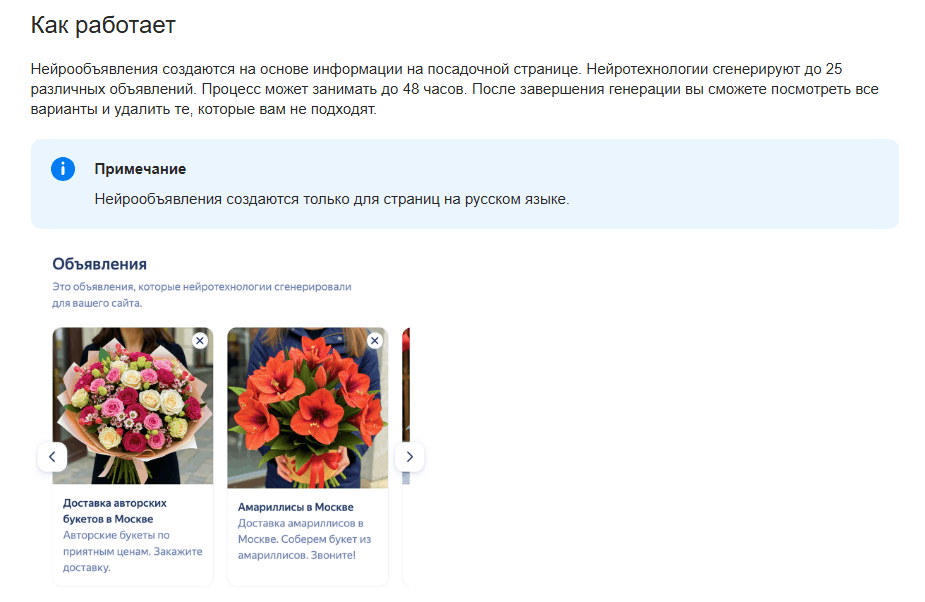 Еще одно достижение прогресса — генерация объявлений на основе посадочных страниц. Рекламные кабинеты движутся в сторону полной автоматизации, где бизнесу не нужно будет иметь штат из копирайтера, дизайнера и директолога. Достаточно указать ссылку на сайт и бюджет.