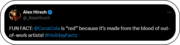 Создатель «Гравити Фолз» Алекс Хирш пошутил на тему так: «Забавный факт: Coca-Cola красная, потому что сделана из крови безработных художников».