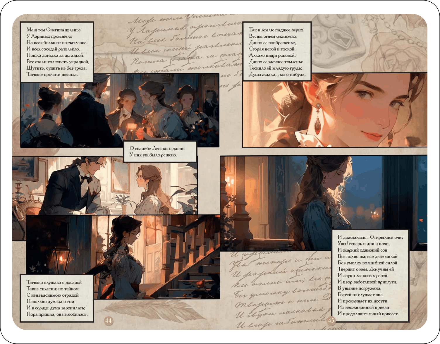 «Иллюстрации передают не только внешность персонажей, но и их внутренний мир, их чувства и страсти. Вы сможете прочувствовать все нюансы и противоречия героев, их радости и печали, любовь и отчаяние. Приготовьтесь к уникальному путешествию по романтической России XIX века».