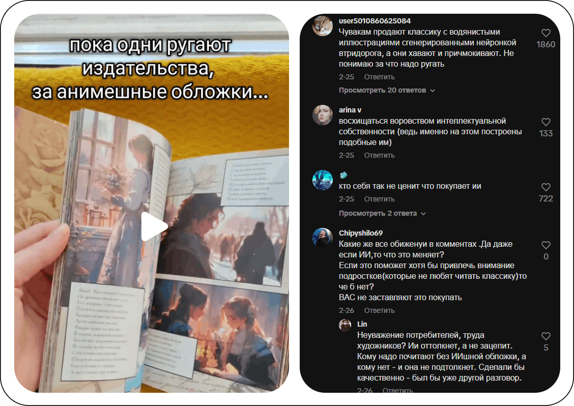 Художница Анастасия Соловьева, которая работала с ИИ для создания артов, подверглась травле в профессиональном сообществе. Аудитория восприняла роман резко негативно — ругали как само решение использовать нейросети, так и качество. В инфополе вернулось обсуждение условий работы в издательстве АСТ, руководство которого ставит художникам нереальные дедлайны и платят сильно ниже рынка.
