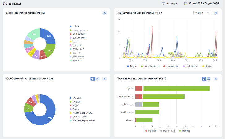 Например, у вас есть карточка в Яндекс Картах и 2GIS, группа ВКонтакте. Там вы регулярно обновляете информацию, следите за отзывами и отвечаете клиентам. Кажется, что репутация под контролем. Но стоит подключить мониторинг, как всплывает Youtube, Дзен и Телеграм. Компания не ведет каналы и ничего не публикует на ресурсах, но упоминания есть.
