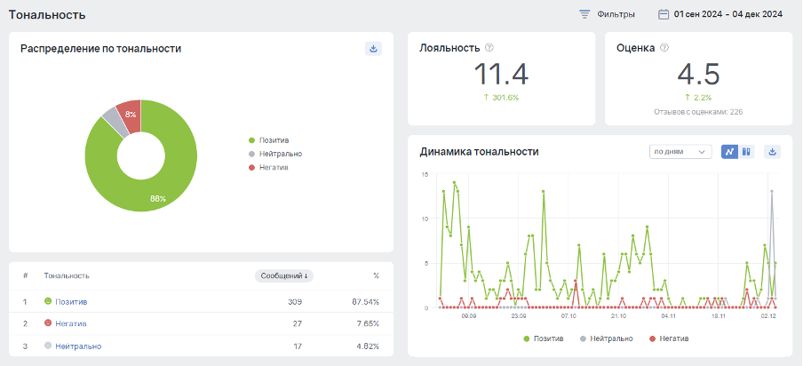 Brand Analytics сортирует упоминания по тональности: негативные, позитивные, нейтральные. На основе преобладающей тональности формируется оценка лояльности, она же индекс лояльности аудитории, и средняя оценка компании. В одноименной вкладке доступна статистика за выбранный период.