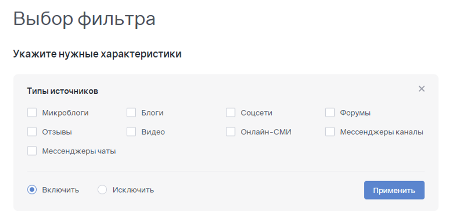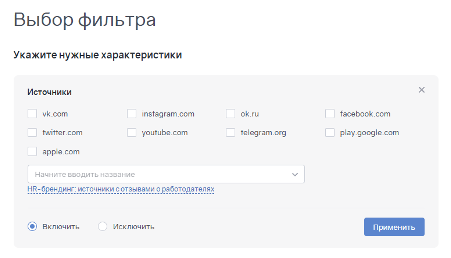 Например, вы хотите отслеживать упоминания в потенциально опасных источниках: черных списках, городских пабликах, в группе враждебно настроенного блогера. Выберите «источники», отметьте нужные ресурсы.