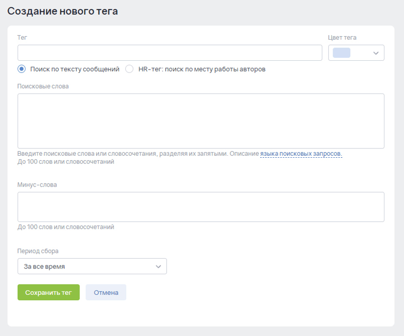 Теги это своеобразные подтемы, которые добавляются вручную. По ним вы сможете найти интересные сообщения, быстро отреагировать на негатив и принять меры. Например, вы подключаете мониторинг для мебельной фабрики. Компания продает диваны, кровати, шкафы и кухни. С последней позицией есть проблемы — клиенты жалуются на качество и замеры, много негатива. Отзывы про кухни для вас приоритетнее, чем про диваны. Добавляем тег «кухни». Система автоматически будет присваивать упоминаниям подходящий тег. Для создания тега нажмите на плюс.