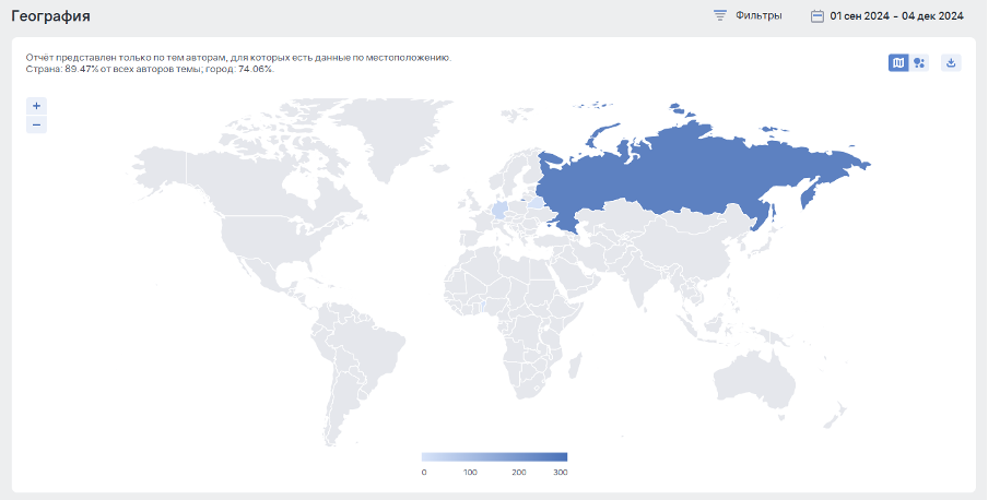 Аналогично сводке пола и возраста авторов ситуация обстоит с географией: если в аккаунте москвича стоит Лос Анджелес, подтянется гео США. Данные примерные и основаны на информации в аккаунте, без привязки к ip. Тем не менее, вы можете получить срез активности авторов по странам, городам и регионам.