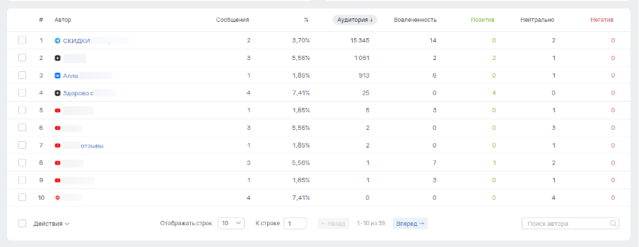 Также Brand Analytics приводит список авторов, их аудиторию, вовлеченность и число сообщений за период. С помощью данной сводки компания может найти лидеров мнений для рекламных интеграций или вычислить недовольного клиента, который регулярно упоминает бренд. В первую очередь ориентироваться стоит на вовлеченность — показатель реального интереса пользователей к контенту автора: репостов, комментариев, лайков. Вы можете кликнуть на автора и посмотреть содержание сообщений, в каком контексте упоминают бренд.