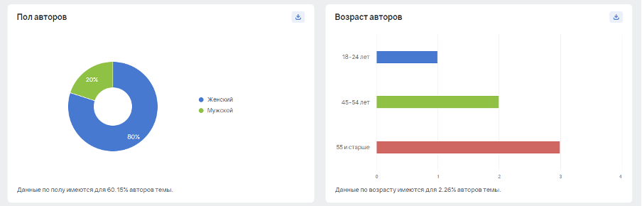 Также сегментирует пол и возраст авторов. Тут стоит учитывать, что данные имеют погрешность: не все указывают пол и возраст в аккаунте, не у всех пол соответствует действительности. К примеру, если жена написала отзыв с аккаунта мужа. Мать написала отзыв с аккаунта дочери. Возраст и пол система посчитает так, как указано в аккаунте.