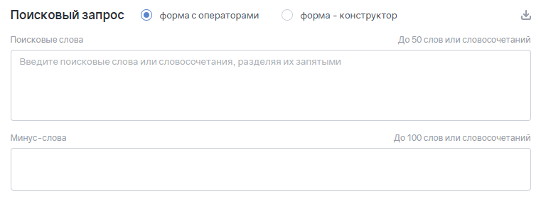 Настройка Brand Analytics начинается с подбора семантики — ключевых слов, по которым программа будет собирать упоминания. Чем точнее и полнее семантика, тем больше информации получится собрать. Доступно два варианта: форма с операторами и форма-конструктор. У сервиса есть подробная инструкция по подбору и работе с ключевыми словами.