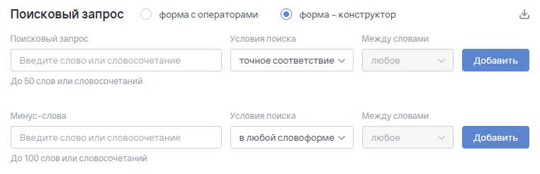 Форма-конструктор позволяет настроить операторы внутри сервиса, выбрать любую словоформу для ключа или точное соответствие.