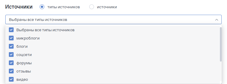 Выберите источники — откуда Brand Analytics будет собирать упоминания. Мы рекомендуем оставлять все для полноты охвата инфополя. Если сегодня о вас не пишут в микроблогах, не факт, что не напишут завтра.