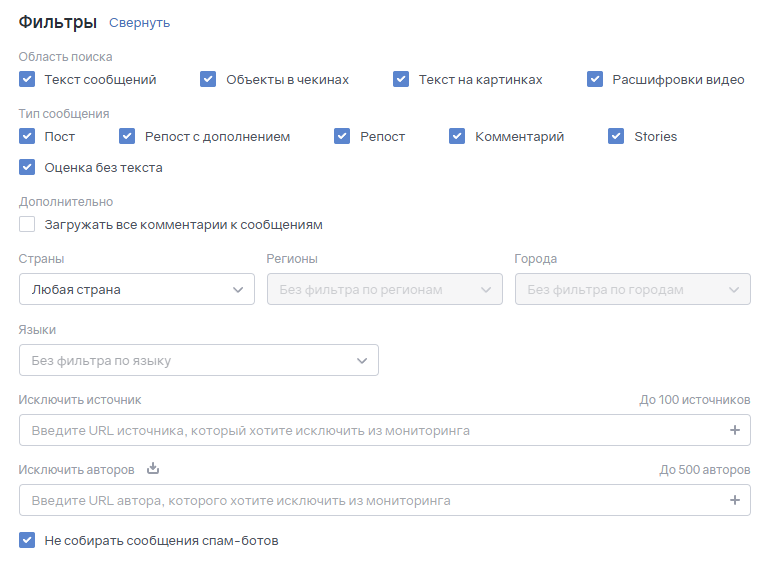 В выпадающем поле доступны дополнительные настройки: гео, тип упоминаний, язык. Вы можете исключить источники из анализа. Например, если не хотите собирать упоминания с собственного сайта.