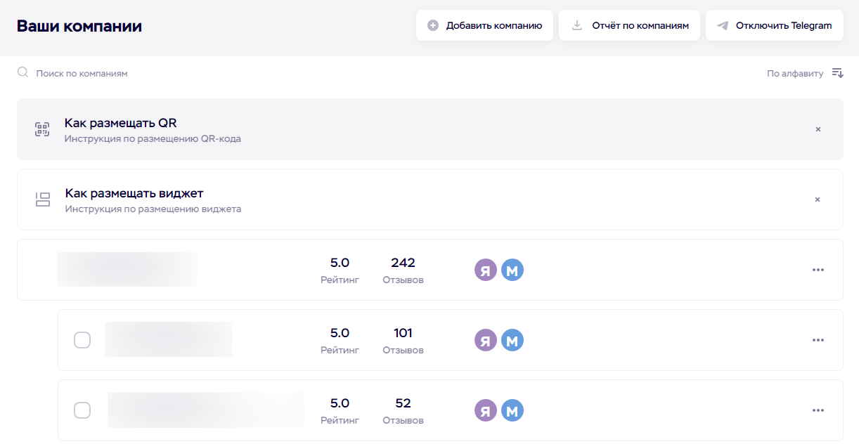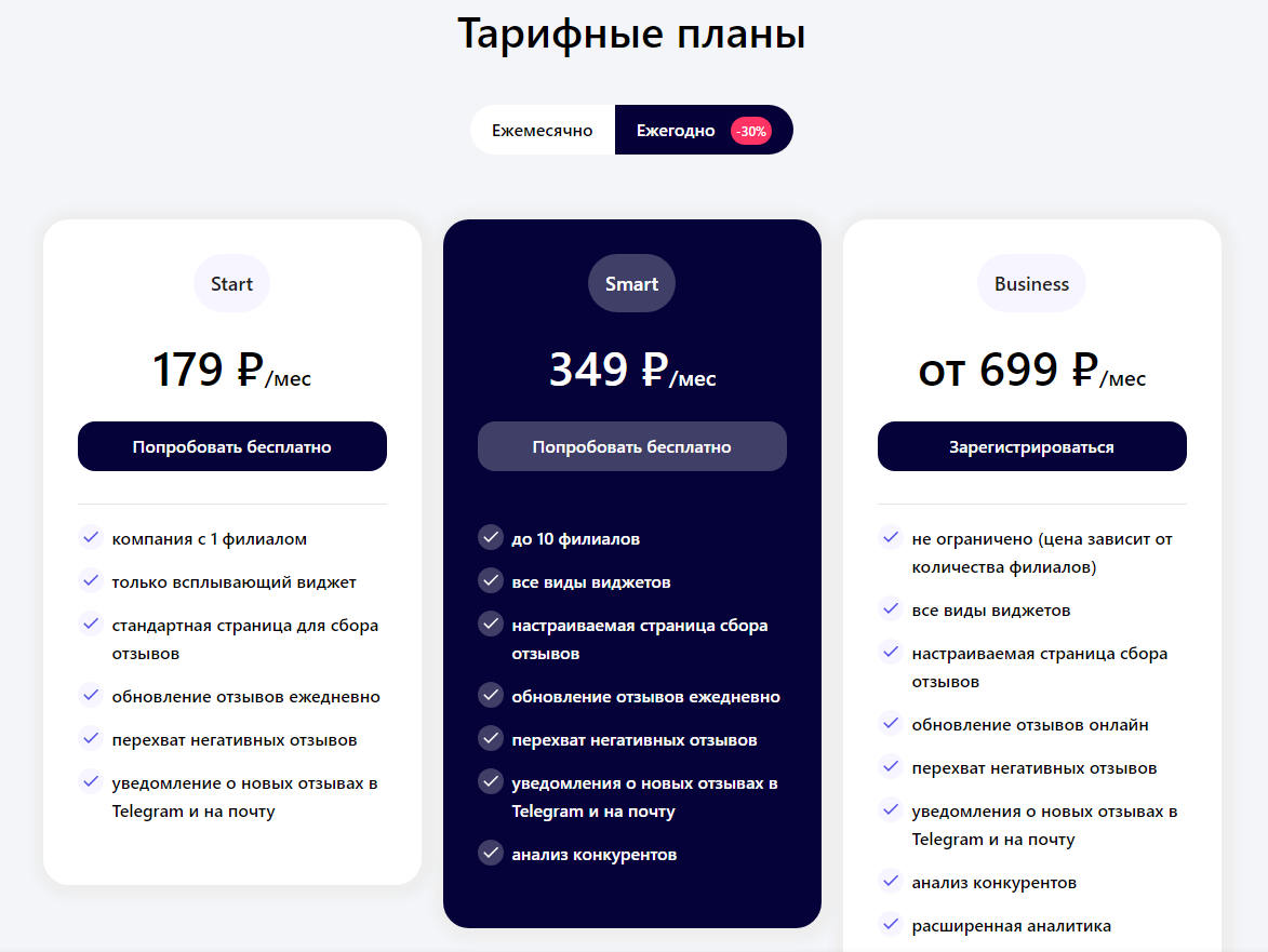 Использование сервиса платное, на выбор есть три тарифа и пробный период в 7 дней для ознакомления с функционалом. Площадки, с которыми позволяет работать сервис: Яндекс.Карты, Google Maps, 2ГИС, Zoon, Yell, Flamp, Prodoctorov, Яндекс.Услуги, Авито, Отзовик, НаПоправку, СберЗдоровье, Яндекс.Бизнес.