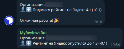 Сбор обновляется несколько раз в день, мониторя выбранные площадки. Плюсы — можно оперативно ответить клиенту и отследить динамику появления упоминаний по каждой площадке. Также в бот приходят оповещения об изменении рейтинга на отзовиках.