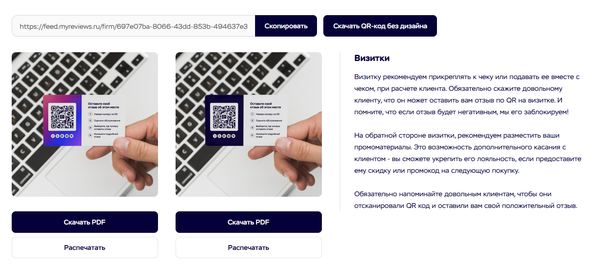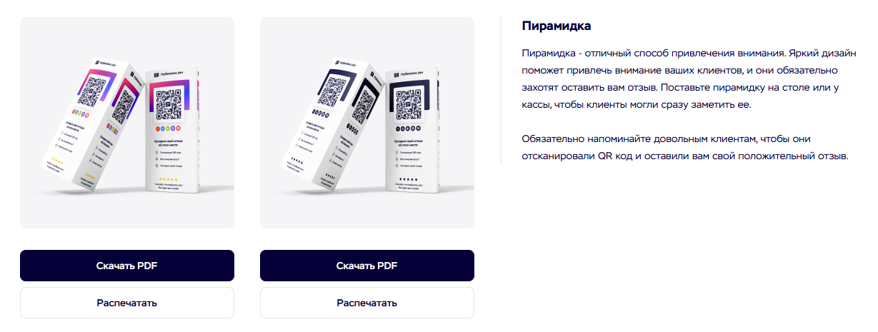 На выбор MyReviews предлагает несколько вариантов qr-кодов: для визиток, А4, пирамидка, без дизайна.