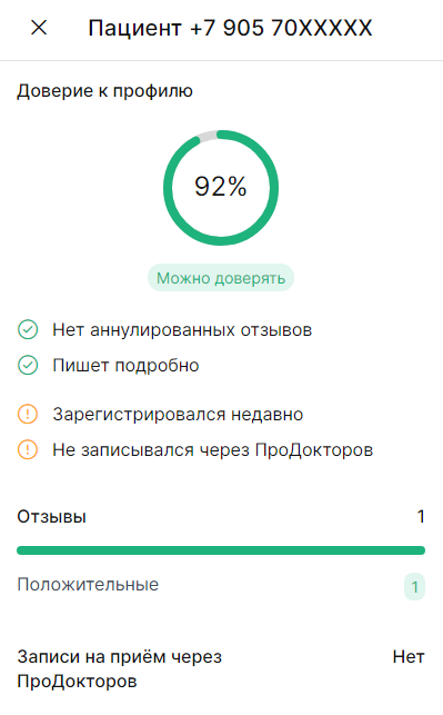 На сайте у пользователей нет ников, пола и аватарок, их заменяют первые цифры номера. Вы можете кликнуть на профиль и посмотреть количество отзывов автора, соотношение позитива к негативу, примерные данные о регистрации. ПроДокторов сознательно ограничивает наполнение профиля автора, объясняя меры безопасностью пациентов. Мнения неавторизованных пользователей не учитываются в рейтинг.