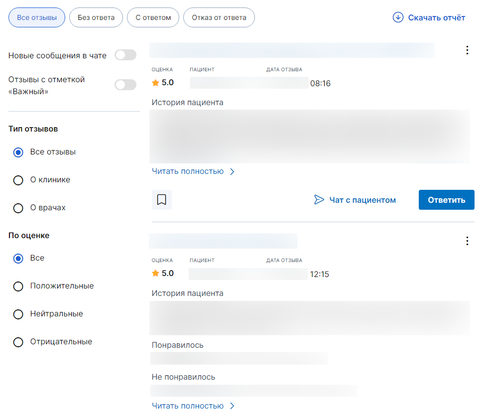 Отзывы на врачей и на клинику отображаются во вкладке «Отзывы». Здесь вы можете выбрать сортировку по новизне, рейтингу, статусу. Ответить пациентам.