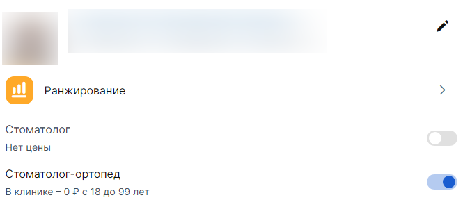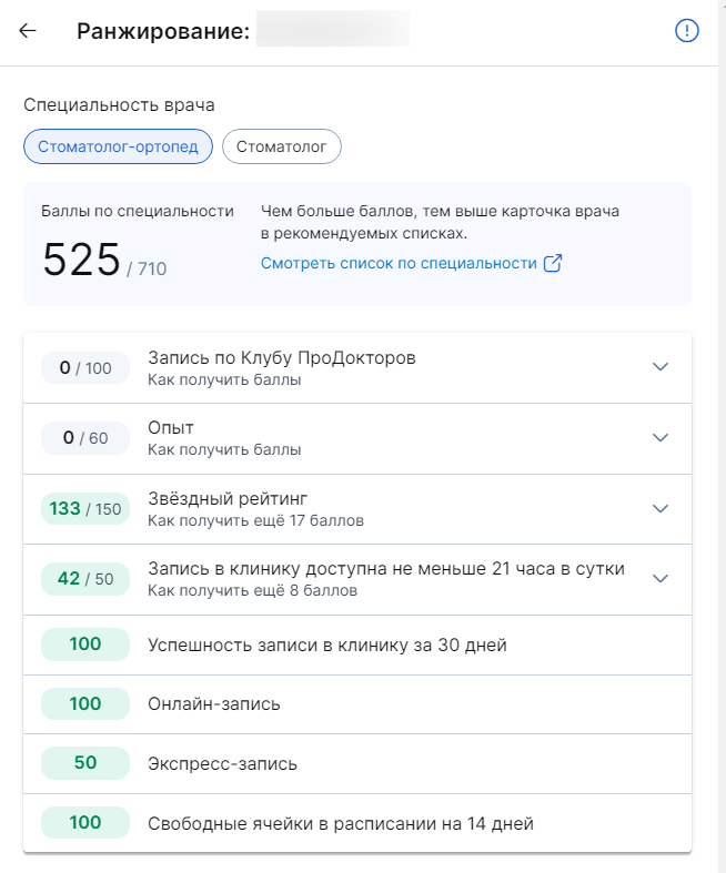 Поскольку пациенты ищут не только клиники, но и конкретных специалистов, поддерживайте высокое место врача по специальности. Посмотреть место в выдаче можно по кнопке «ранжирование» в личном кабинете.