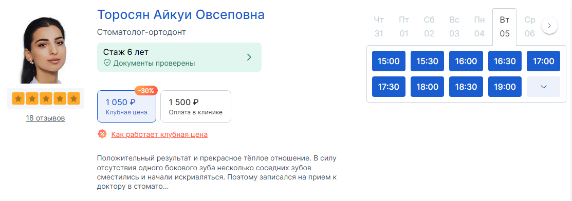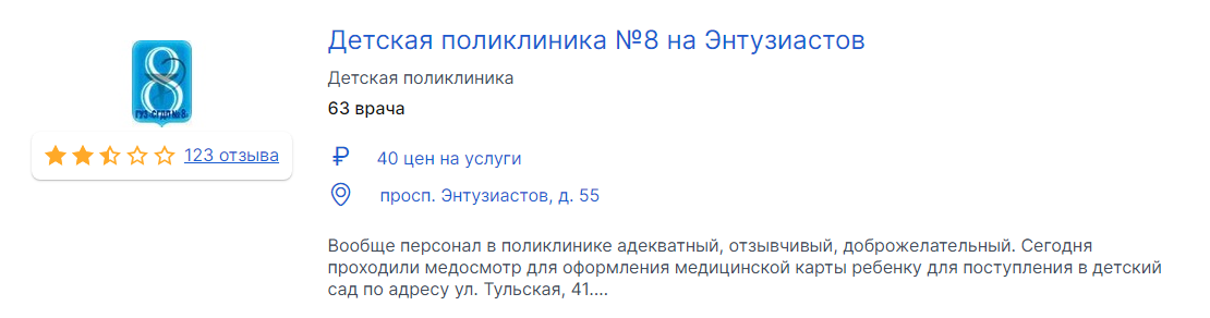 Несмотря на сложности с модерацией отзывов, присутствие на площадке обязательно для клиник и медицинских центров. Так вы гарантированно попадете в зону видимости клиентов и, если рейтинг хороший, добавите себе очков доверия. Также это вопрос удобства — многие пациенты записываются на прием через ПроДокторов, минуя сайты клиник. Благодаря высокому трафику, площадка занимает 1-3 позиции в ТОПе по брендовому запросу.