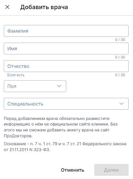 Перейдите во вкладку «Врачи», нажмите «Добавить врача», заполните информацию. Модерация не пропустит врача, который не размещен на официальном сайте клиники, поэтому сперва стоит проверить актуальность информации на сайте.