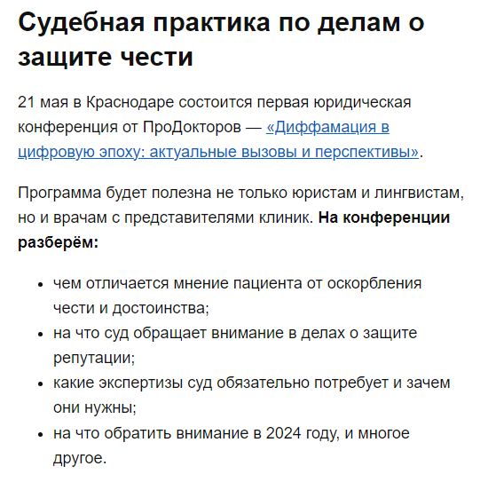 Есть еще третий способ — иск в суд. Мы не рекомендуем пробовать судиться с порталом. Как крупнейший рекомендательный ресурс в сфере медицины, площадка постоянно сталкивается с репутационными исками и разбирательствами. Более того, активно делится успехами в суде. Подобные дела освещают СМИ и Медвестник, так что площадка имеет мощную медийную поддержку и не против ославить компании, которые решили пойти на конфликт.