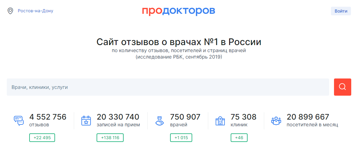ПроДокторов — крупнейший профильный медицинский ресурс для поиска врачей и клиник с ежемесячным трафиком более 20 миллионов посещений. Позиционирует себя как СМИ. Площадка позволяет делиться мнениями о клиниках и специалистах, продвигать медицинские организации и работать с репутацией. Помимо функций крупного отзовика, ПроДокторов хранит электронные медкарты пациентов, позволяет записываться на прием через портал, проводит конференции, активно участвует в жизни медицинского сообщества.