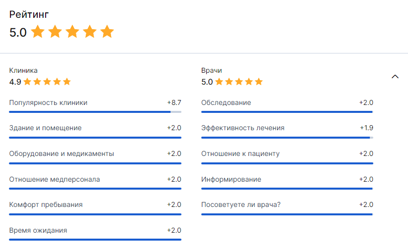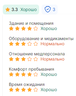 Рейтинг клиники формируется на основе оценок и содержания отзывов. Алгоритм собирает данные по ключевым направлениям, получая среднее арифметическое. Поэтому отзыв может содержат оценку с десятичными, чего нет на других рекомендательных ресурсах, либо иметь только текстовую часть.