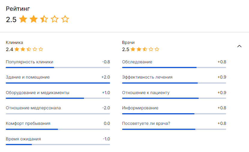 Важно понимать, что у клиники и врачей индивидуальные рейтинги, которые взаимосвязаны, но рассчитываются отдельно. Например, если рейтинг сотрудников клиники в среднем 4 звезды, а у одного врача 2, пострадает общий рейтинг клиники.
