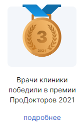 ПроДокторов отбирает лучшие 30 клиник и врачей по регионам, номинаций довольно много. Главным критерием оценки выступает народный рейтинг.