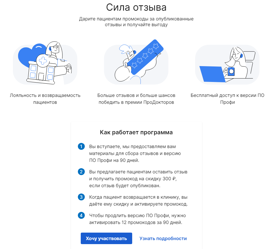 Площадка категорически против заказных отзывов, но не против стимуляции реальных клиентов через платные функции сайта. ПроДокторов предлагает собирать обратную связь через них, операторы сами прозванивают ваших пациентов, а также предлагают систему QR-кодов. Соответственно, проход у таких положительных отзывов выше обычных.