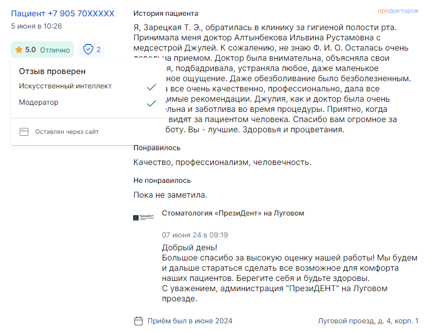 Площадка славится многоступенчатой модерацией и внимательным отношением к отзывам. К примеру, для публикации положительного отзыва у пациента запрашивают фото\скан выписки с печатью клиники, иные документы подтверждения приема. Если модераторы сочтут текст недостаточно подробным, отзыв также отклонят.