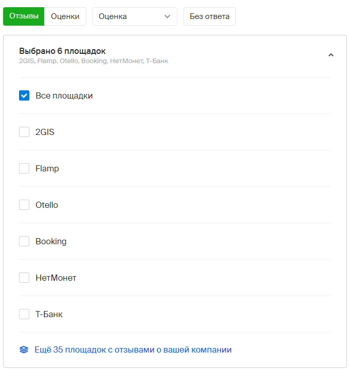 Зайдите в личный кабинет, вкладка «Отзывы». В бесплатной версии вам доступны шесть площадок, можно настроить отображение нужных, выбрать все отзывы или только «без ответа». Сортировать по оценкам.