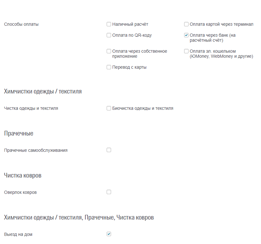 Во вкладке «дополнительные атрибуты» выберите пункты, которые имеют к вам отношение: способы оплаты, дополнительные услуги, доступность среды.