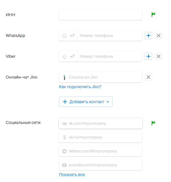 Укажите реквизиты, мессенджеры, ссылки на социальные сети. Смысла вписывать все нет. Например, если компания не ведет активную запись в Viber, не указывайте его.