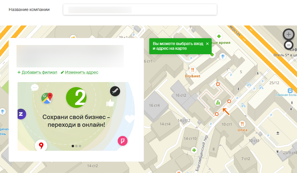 Теперь вы можете уточнить название и адрес, добавить информацию о входах. Это удобно, если организация расположена во дворе, на углу или с торца здания, имеет несколько входов.