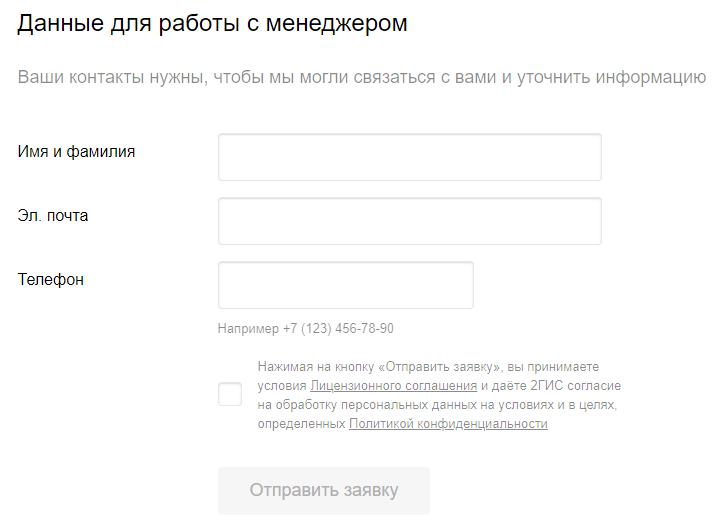 Укажите данные для работы с менеджером. Компания появится в справочнике только после того, как менеджер свяжется с представителем по телефону (в течение трех дней) и подтвердит, что данная организация действительно находится по указанному адресу.
