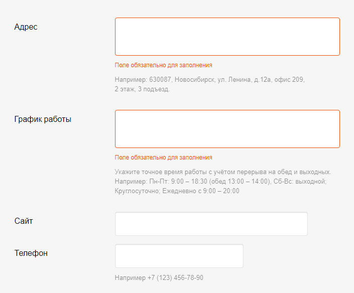 Укажите точный адрес и график работы. Позже информацию можно будет изменить в личном кабинете.