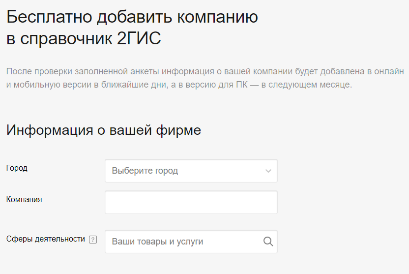 Заполните соответствующие поля. Название компании указывайте в связке со сферой, так сервису будет проще соотнести категорию и организацию, а вы получите больше трафика. Например: салон красоты Красавица, клининговая компания Чистюля.