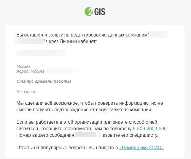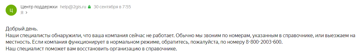 Как и другие геосервисы, 2gis вправе самостоятельно вносить изменения в данные об организациях, актуализировать на основе мнений пользователь, присваивать закрытый статус, удалять из справочника, если видит для этого основания. На почту придет уведомление о закрытии.