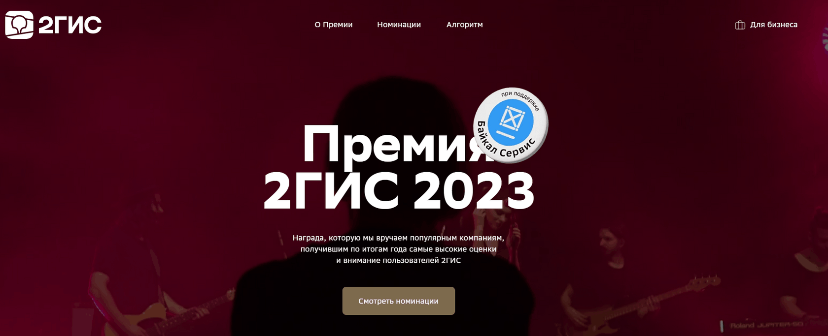 Ежегодно 2гис проводит премию, где выбирает организации года в следующих нишах: гостиницы, авто, красота, здоровье, поесть, цветы и других. Список постоянно пополняется. В 2024 году награждение прошло в мае, победители основывались на данных 2023 года.
