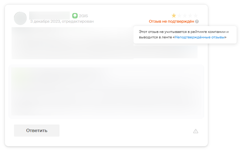 С последним все понятно, с удаленным тоже — отзыв пропадает из карточки. Категория «перемещен в неподтвержденные» интереснее. Туда попадают отзывы, авторы которых не предоставили дополнительных данных для идентификации. Они остаются в карточке, но не показываются вместе с остальными отзывами и не влияют на рейтинг. Клиент может прочесть неподтвержденные отзывы, если кликнет на спойлер.