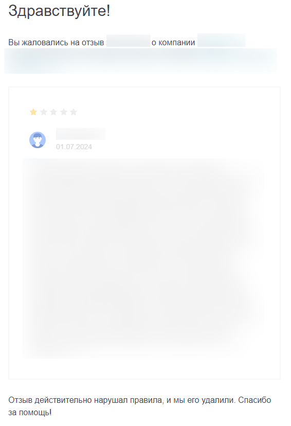 Удалять отзывы следует аккуратно. Дело в том, что в отличие от Яндекс Карт, в 2гис пользователь получает уведомление о том, что его отзыв удалили за нарушение правил. В письме не указано кто подал жалобу и за что конкретно отзыв удалили, но сам факт может спровоцировать волну негатива. Есть категории клиентов, которые воспринимают подобный акт как личное оскорбление и готовы тратить время на новые отзывы. При этом, если в первый раз клиент был раздражен, то после удаления он впадает в настоящую ярость.