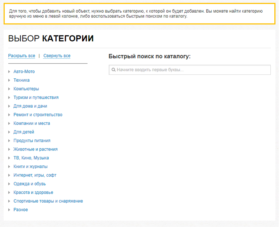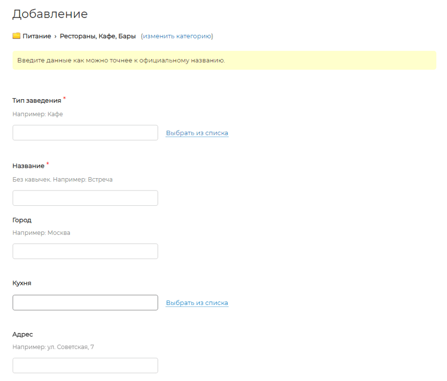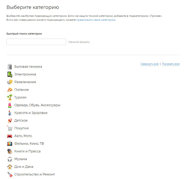 Выберите категорию и подкатегорию бизнеса. От точности выбора зависит расположение в тематических подборках каталога.