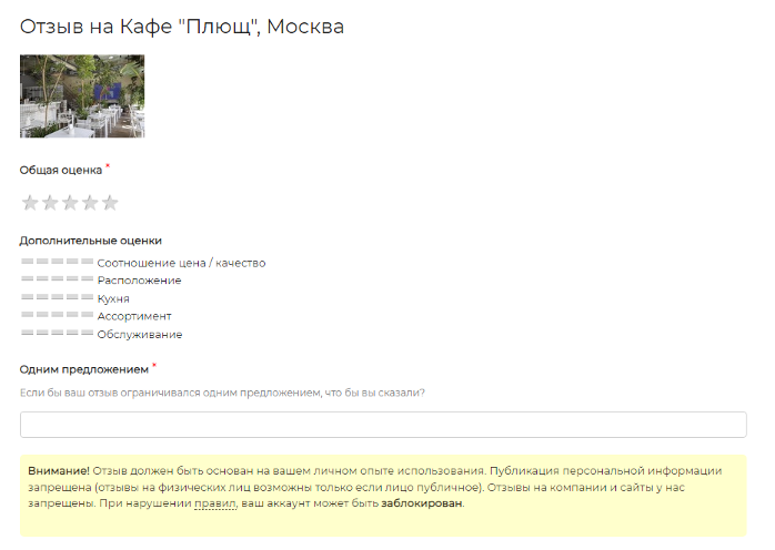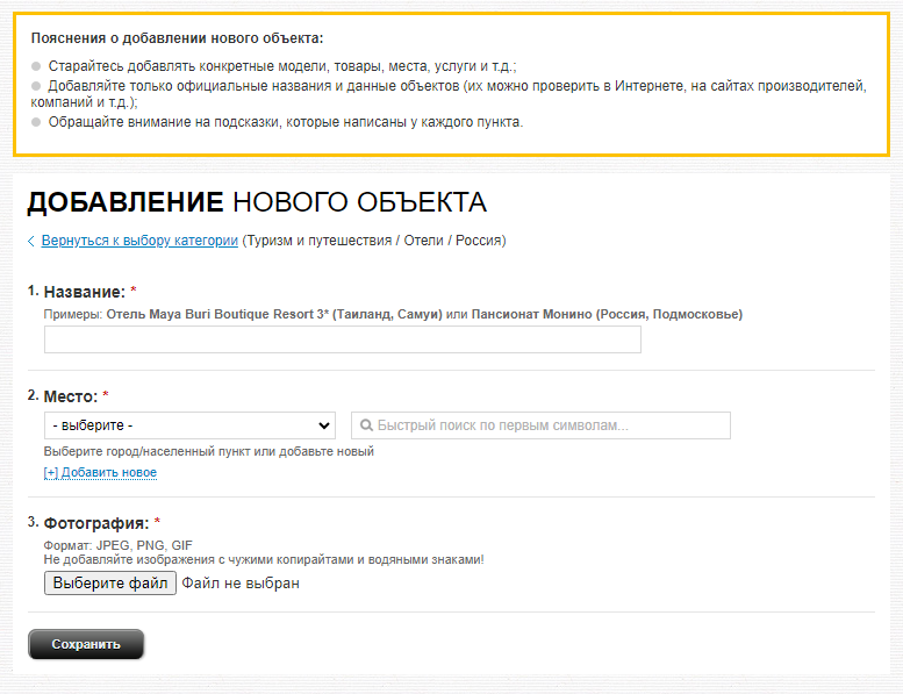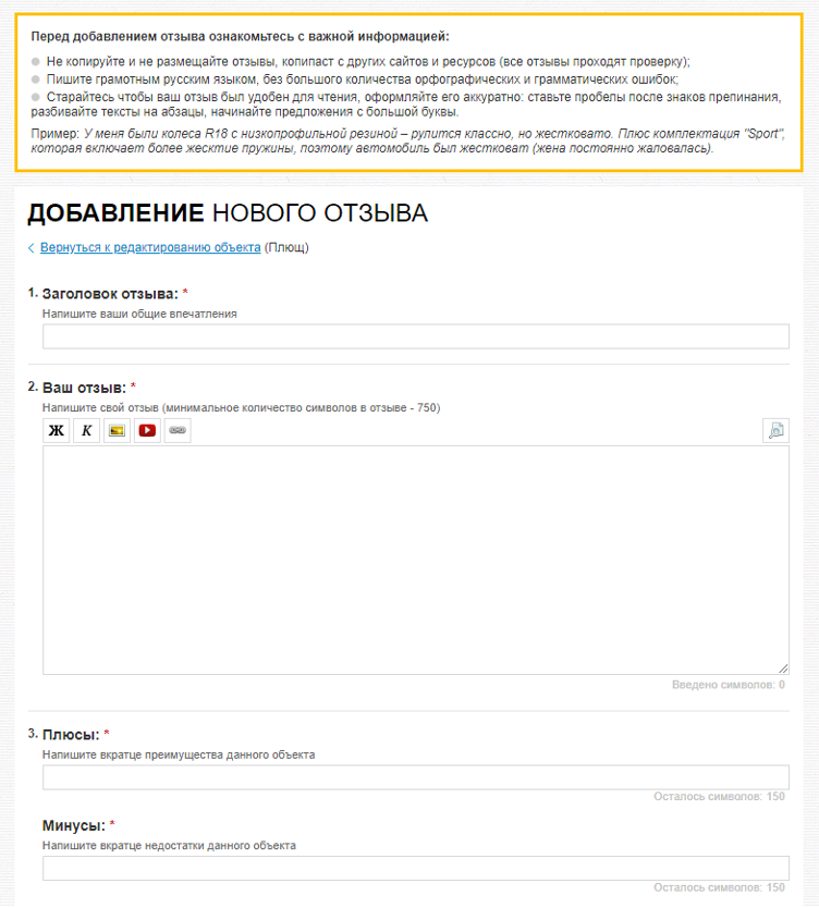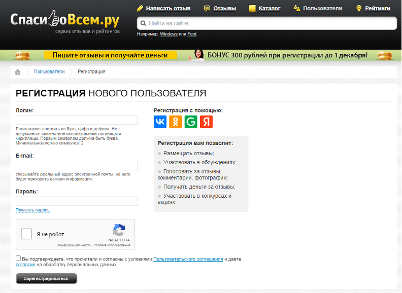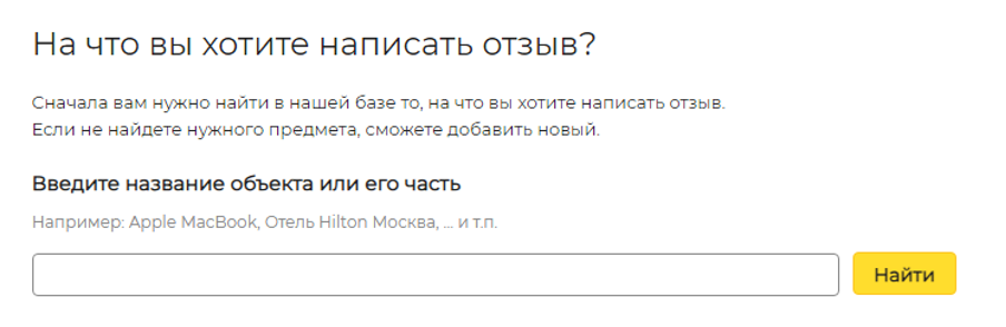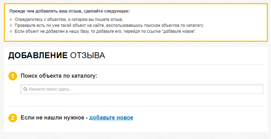 Перейдите на главную страницу сайта. Как и в случае площадки СпасибоВсем, добавить карточку можно только после публикации первого отзыва. Для этого пройдите регистрацию и создайте личный аккаунт.