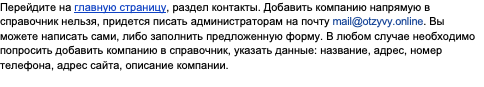 Перейдите на главную страницу, раздел контакты. Добавить карточку напрямую в справочник нельзя, придется писать администраторам на почту mail @otzyvy.online. Вы можете написать сами, либо заполнить предложенную форму. В любом случае необходимо попросить добавить бизнес в справочник, указать данные: название, адрес, номер телефона, адрес сайта, описание.